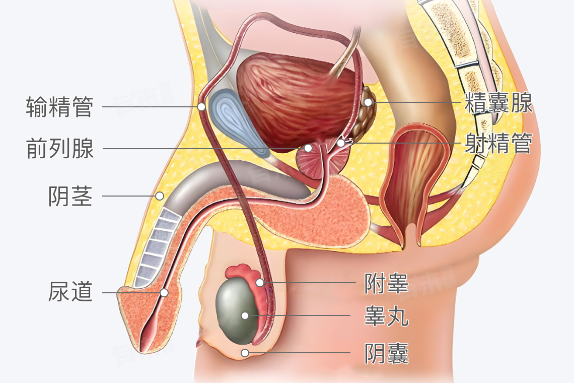 男性生殖系统主要包括内生殖器和外生殖器两个部分,内生殖器包括生殖腺(睾丸)和生殖管道(附睾、输精管、射精管和尿道),以及部分附属腺体(前列腺、精囊腺);外生殖器包括阴囊和阴茎。