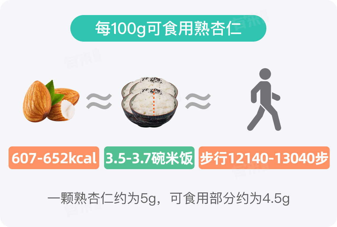 一颗熟杏仁约为5g,可食用部分约为4.5g,其热量为27-29kcal,相当于0.15-0.16碗米饭的热量,这个热量水平明显低于部分成年人一餐所需的热量。
