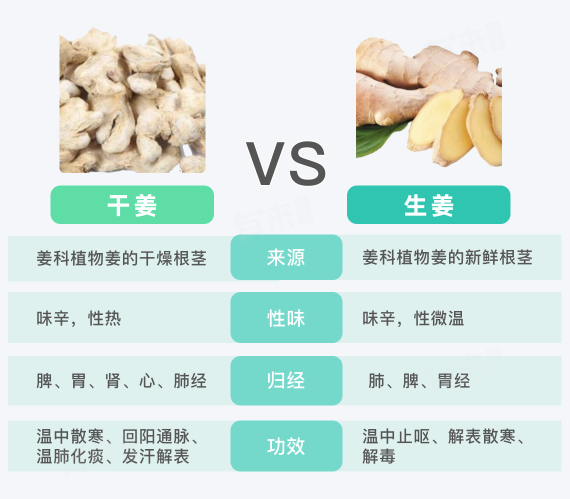 - 干姜:味辛,性热,归脾、胃、肾、心、肺经。