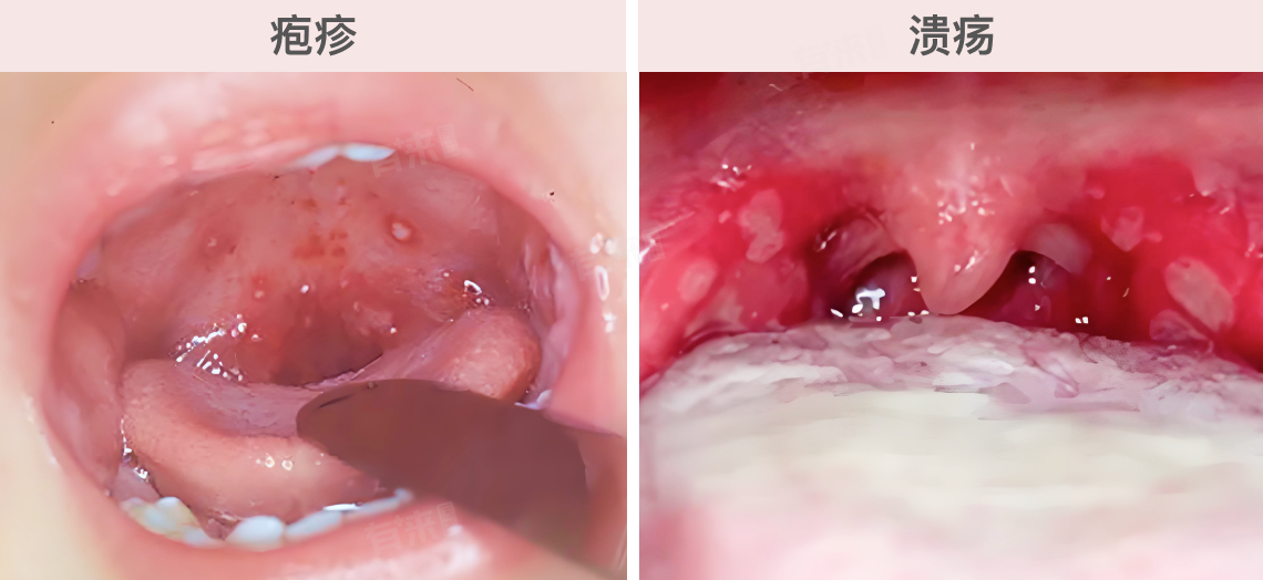 咽峡部出现散在的灰白色疱疹,周围有红晕。疱疹通常为米粒大小,数目不等,可单个出现,也可多个聚集在一起。随着病情的发展,疱疹可能会破溃形成小溃疡,溃疡表面有黄色或白色的渗出物,周围黏膜充血明显。