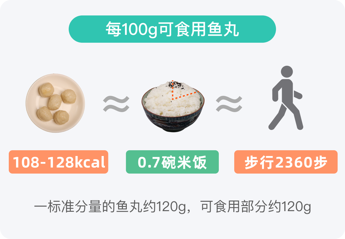 一标准分量的鱼丸约120g,可食用部分约120g,其热量按热量区间的均值进行计算,约142kcal。如果将该热量进行换算,相当于0.8碗米饭的热量,米饭热量按116kcal/100g计算,一碗米饭约150g。因此,在控制总体热量摄入的前提下,适量食用鱼丸并不会导致热量超标。