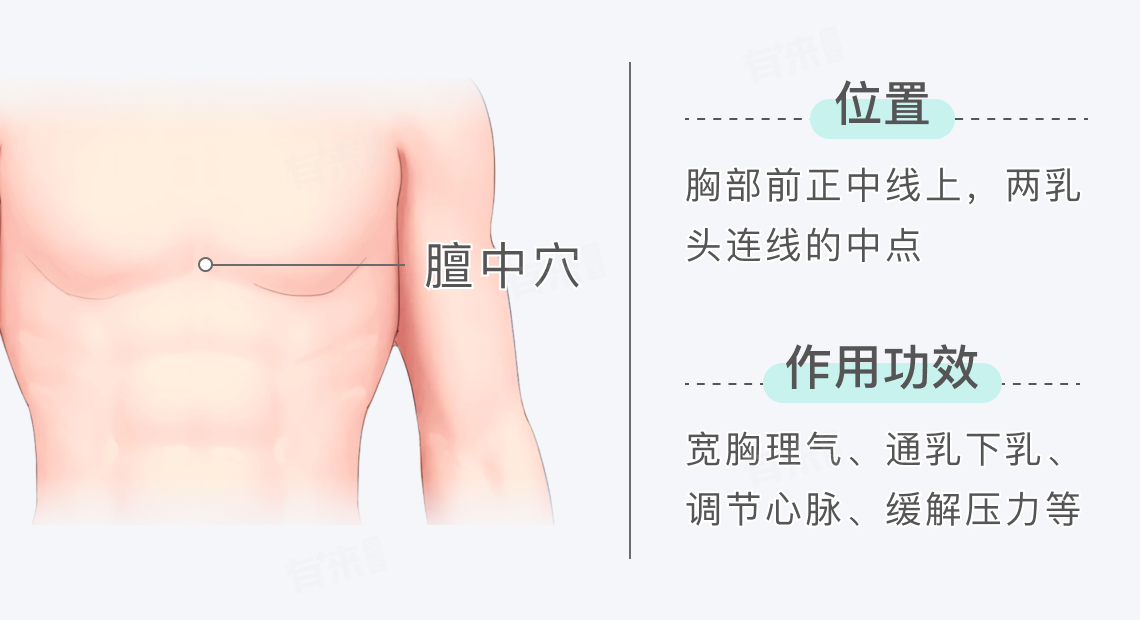 膻中穴是任脉上的腧穴,位置在胸部前正中线上,平第四肋间,两乳头连线的中点。具有宽胸理气、通乳下乳、调节心脉、缓解压力等作用。