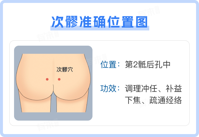 次髎在骶区,具有调理冲任、补益下焦、疏通经络等功效,可通过针刺、艾灸等方式刺激该穴位,以改善月经不调、小便不利、腰骶痛等不适症状。