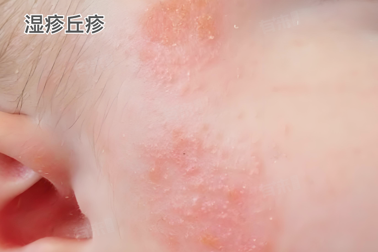 2、湿疹丘疹:急性期湿疹表现为多形性皮疹,其中丘疹为常见形态之一,常与红斑、水疱同时存在,丘疹可融合成片,边界不清,瘙痒剧烈。湿疹可发生于身体任何部位,常见于头面部、耳后、手足、阴囊、肛门等部位,且常呈对称性分布。