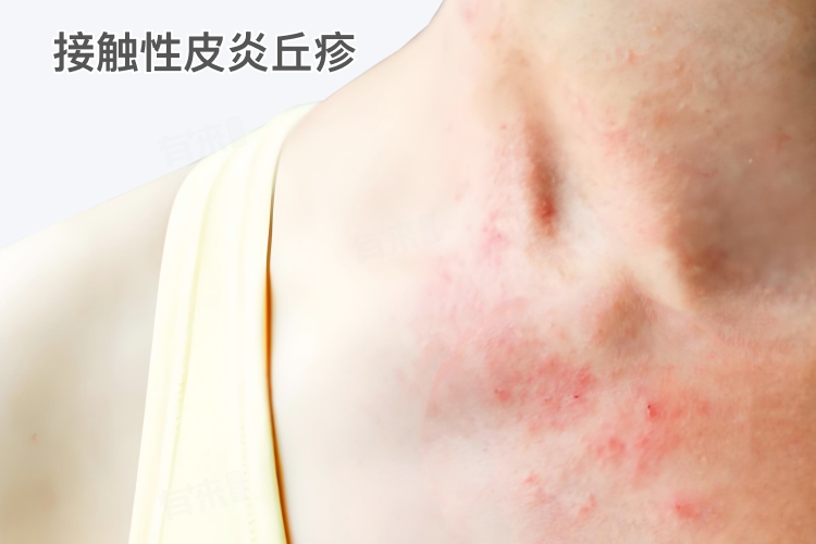 1、接触性皮炎丘疹:急性期表现为接触部位边界清楚的红斑、丘疹,丘疹可密集或散在分布,严重时可出现水疱、大疱,伴有瘙痒或灼痛。