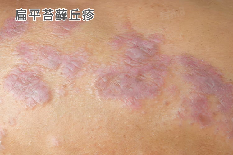 2、扁平苔藓丘疹:表现为多角形或圆形紫红色扁平丘疹,边界清楚,表面有蜡样光泽,可见白色网状条纹,常密集分布或散在分布于皮肤、黏膜(如口腔黏膜)等部位。