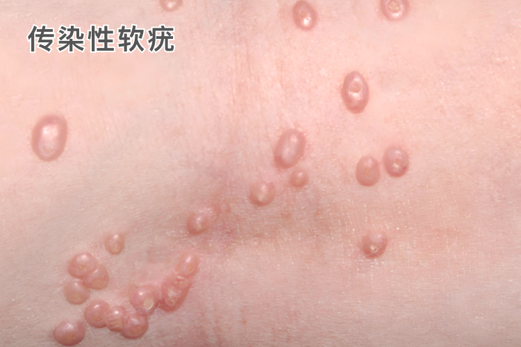 2、传染性软疣:典型的皮疹为半球形丘疹,直径2-5毫米,有蜡样光泽,中央有脐凹,内含乳白色干酪样物质。可发生于身体任何部位,儿童多见于面部、躯干、四肢,成人则多见于下腹部、耻骨部、生殖器及肛周等部位。