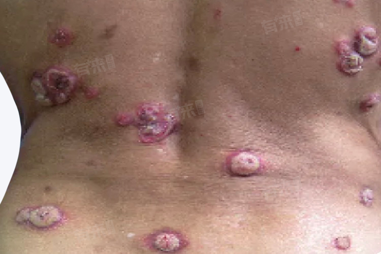 3、卡波西肉瘤:艾滋病晚期常见的恶性肿瘤,表现为红色或紫红色的斑点或丘疹,逐渐增大、融合,形成斑块、结节或肿瘤。病变部位可发生在身体的任何部位,但常见于面部、颈部、四肢等皮肤暴露部位。