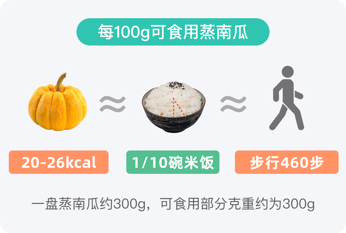 一盘蒸南瓜约300g,可食用部分克重约为300g,以热量均值23kcal进行计算,整体热量约69kcal,这相当于约0.4碗米饭的热量。这里米饭的热量,按每100g/116kcal进行计算,一碗米饭约150g。因此,蒸南瓜是一种低热量、高饱腹感的食物,非常适合作为减肥餐或日常健康饮食的一部分。