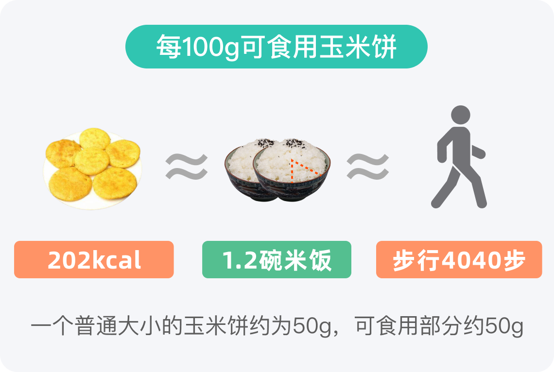 一个普通大小的玉米饼(约50g)为例,在进食后可产生的热量约为101kcal,大约相当于3/5碗米饭。这个热量水平在普通成年人一餐中所占比例虽然不高,但若一次食用过多,有体重增加的风险,仍需控制摄入量。