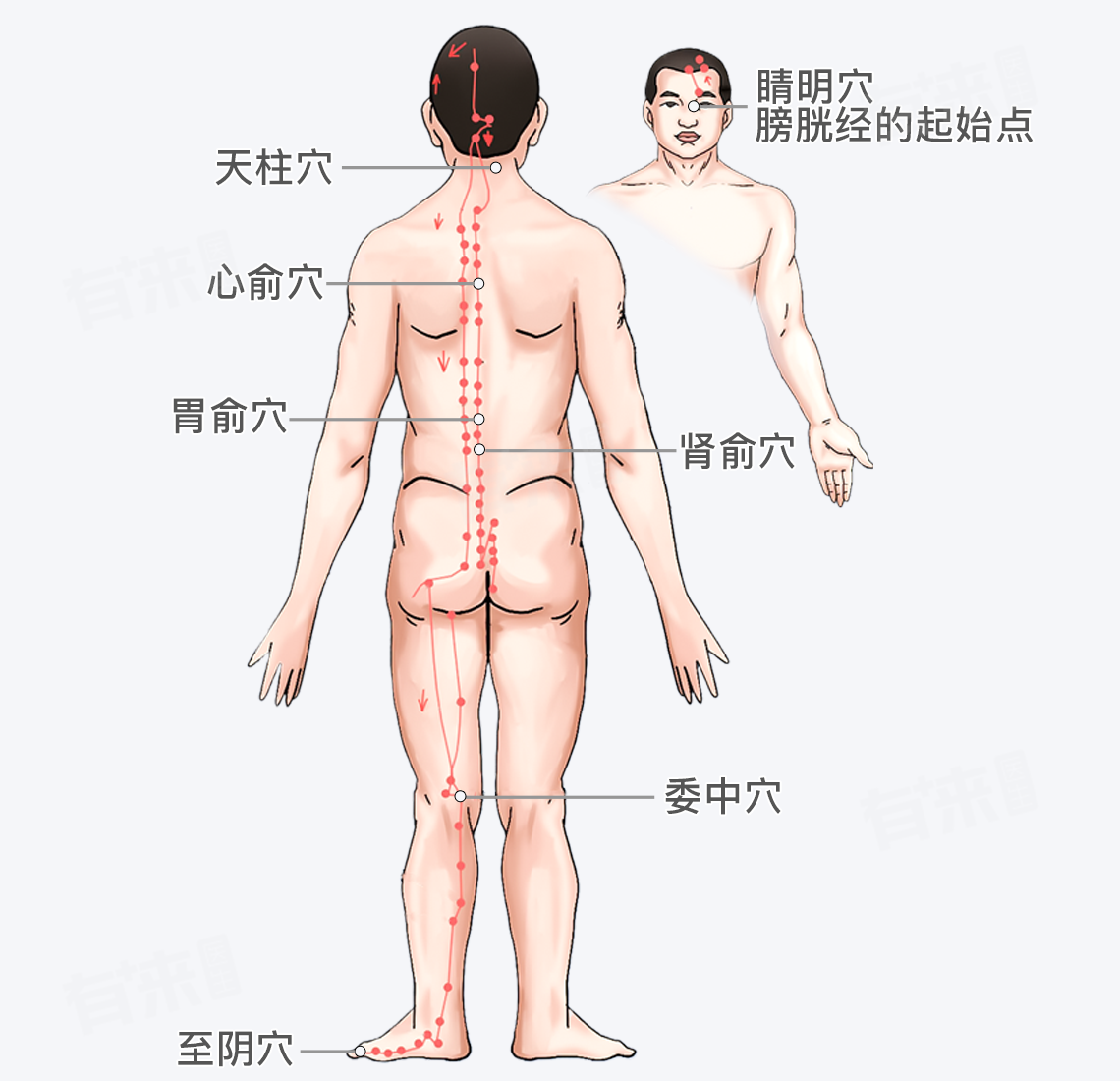 1、头面部:足太阳膀胱经起始于内眼角(睛明穴),上行至额部,左右交会于头顶部(百会穴)。