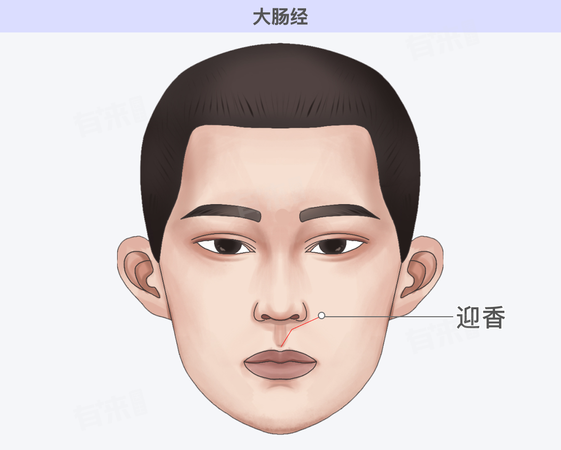 - 位置:大肠经在头部的循行起于食指桡侧端,经过手背行于上肢外侧前缘,上肩,至肩关节前缘,向后到第七颈椎棘突下,再向前下行入缺盆,进入胸腔络肺,向下通过膈肌下行至大肠,其支脉从锁骨上窝上行,经颈部至面颊,入下齿中,回出挟口两旁,左右交叉于人中,至对侧鼻翼旁。