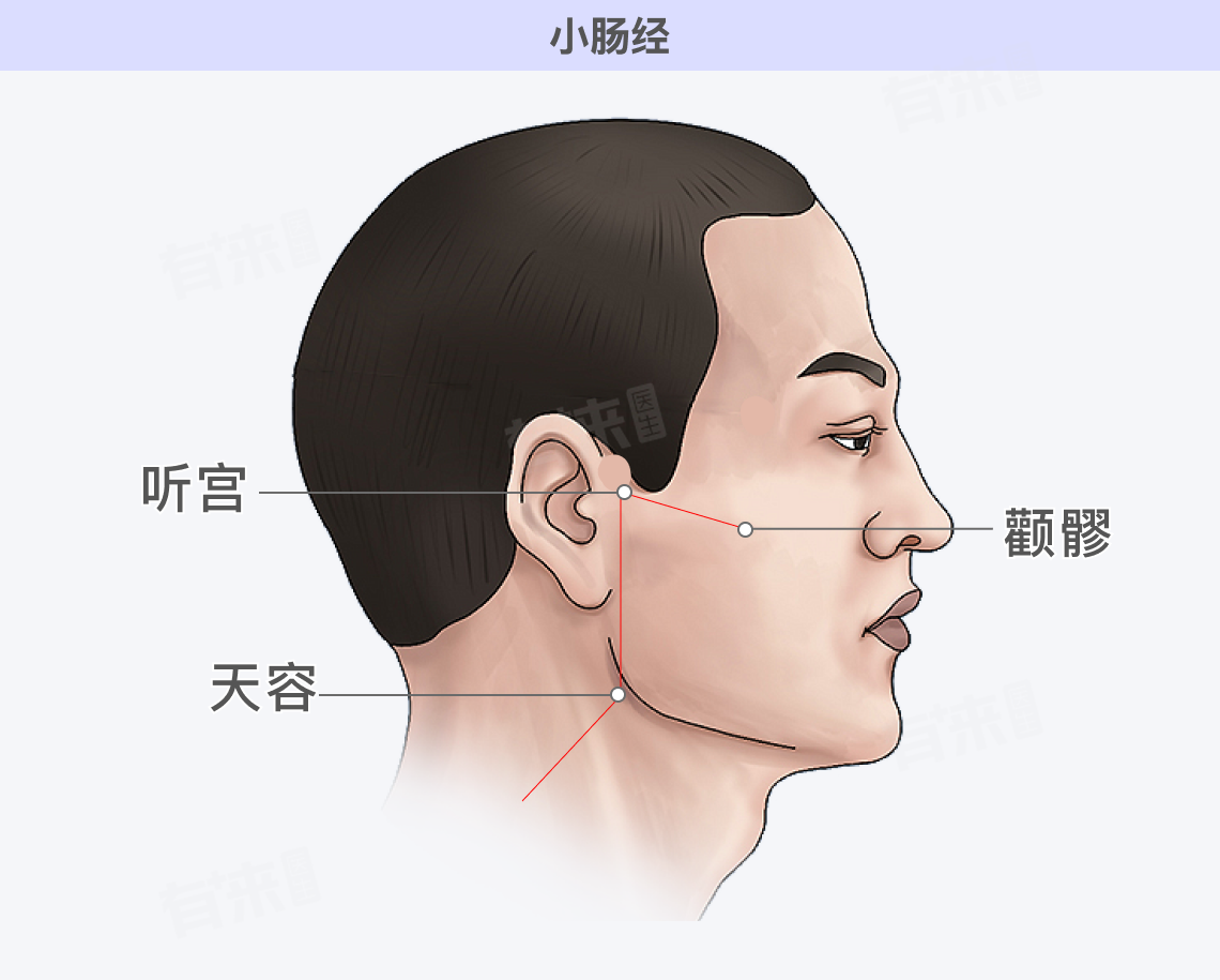 - 功效:在头部主要与营养物质的吸收和神志活动有关,能将脾胃运化后的营养物质更好地输送到头面部,滋养头面部的组织器官,使面色红润、眼睛明亮,同时小肠经气血通畅也有助于维持良好的精神状态,预防失眠、心烦等神志疾病。