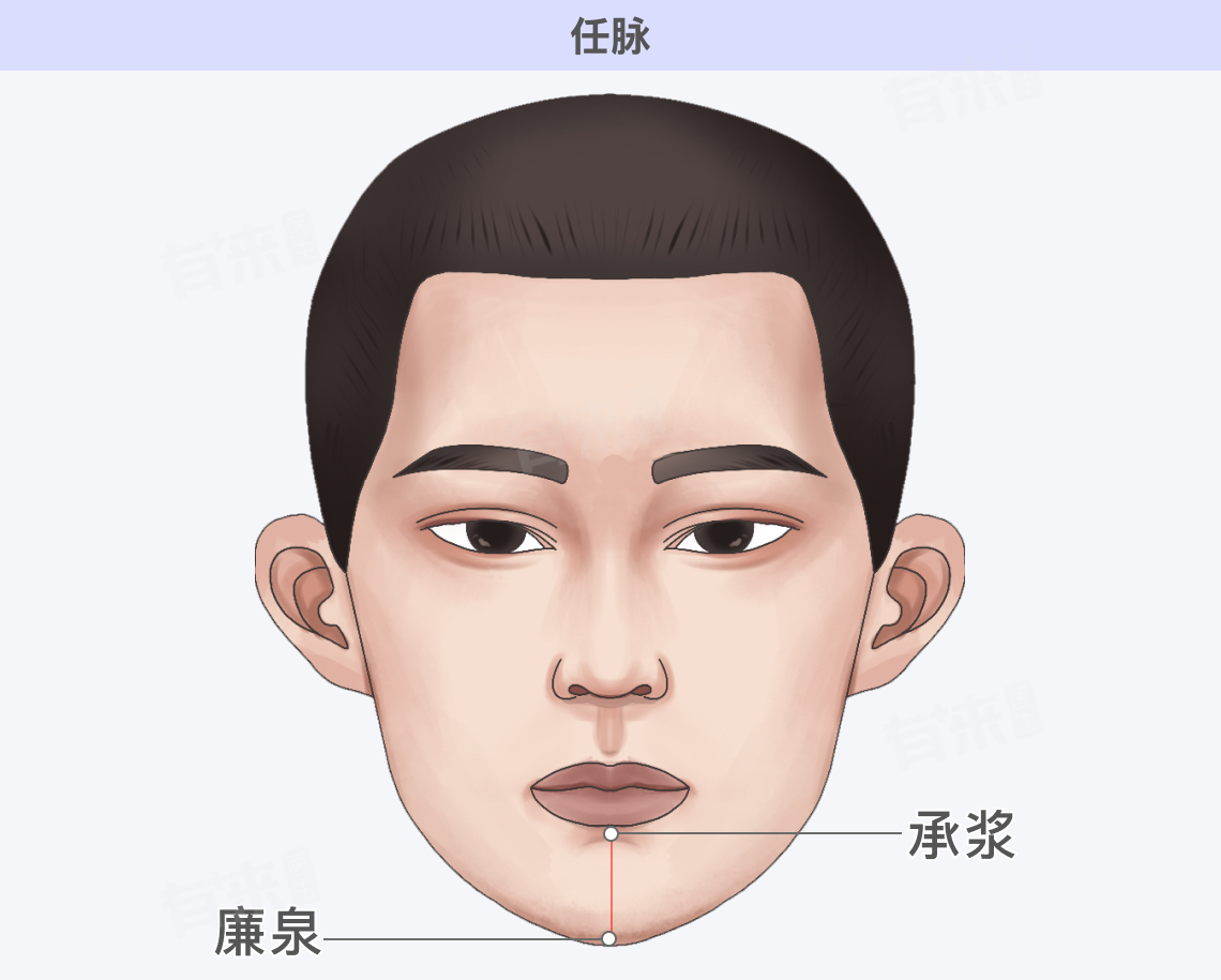 - 位置:任脉行于头部前正中线,起于胞中,下出会阴,经阴阜,沿腹部和胸部正中线上行,至咽喉,上行至下颌部,环绕口唇,沿面颊,分行至目眶下。