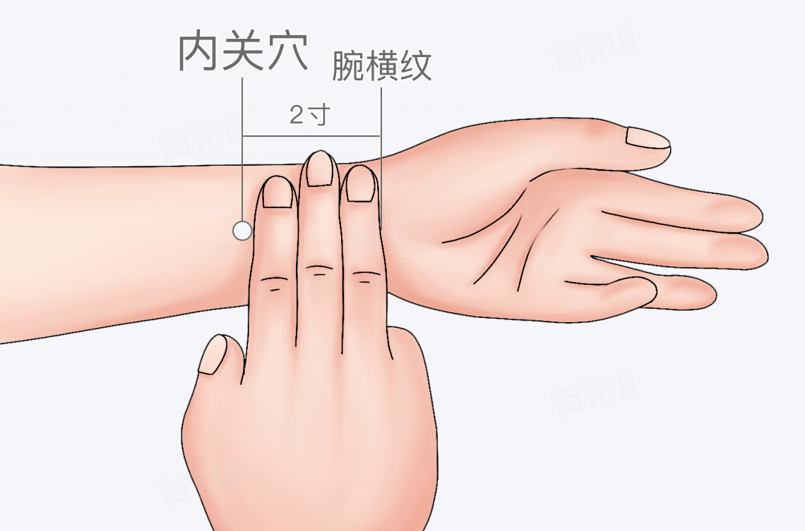 内关穴是手厥阴心包经上的络穴,属于八脉交会穴之一,位于前臂掌侧,腕横纹上2寸(约三横指宽)处。由专业人士正确刺激内关穴有宁心安神、宽胸理气、和胃止痛、通络活血等功效。
