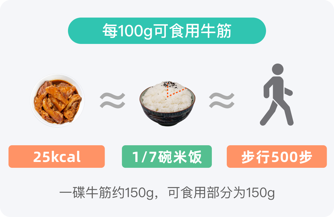 每100g牛筋的热量为25kcal,一碟牛筋(约150g)的热量为38kcal,相当于1/5碗米饭的热量。对于每日推荐摄入热量为2000kcal的成年人而言,一碟牛筋的热量占全天总热量需求的2%左右。