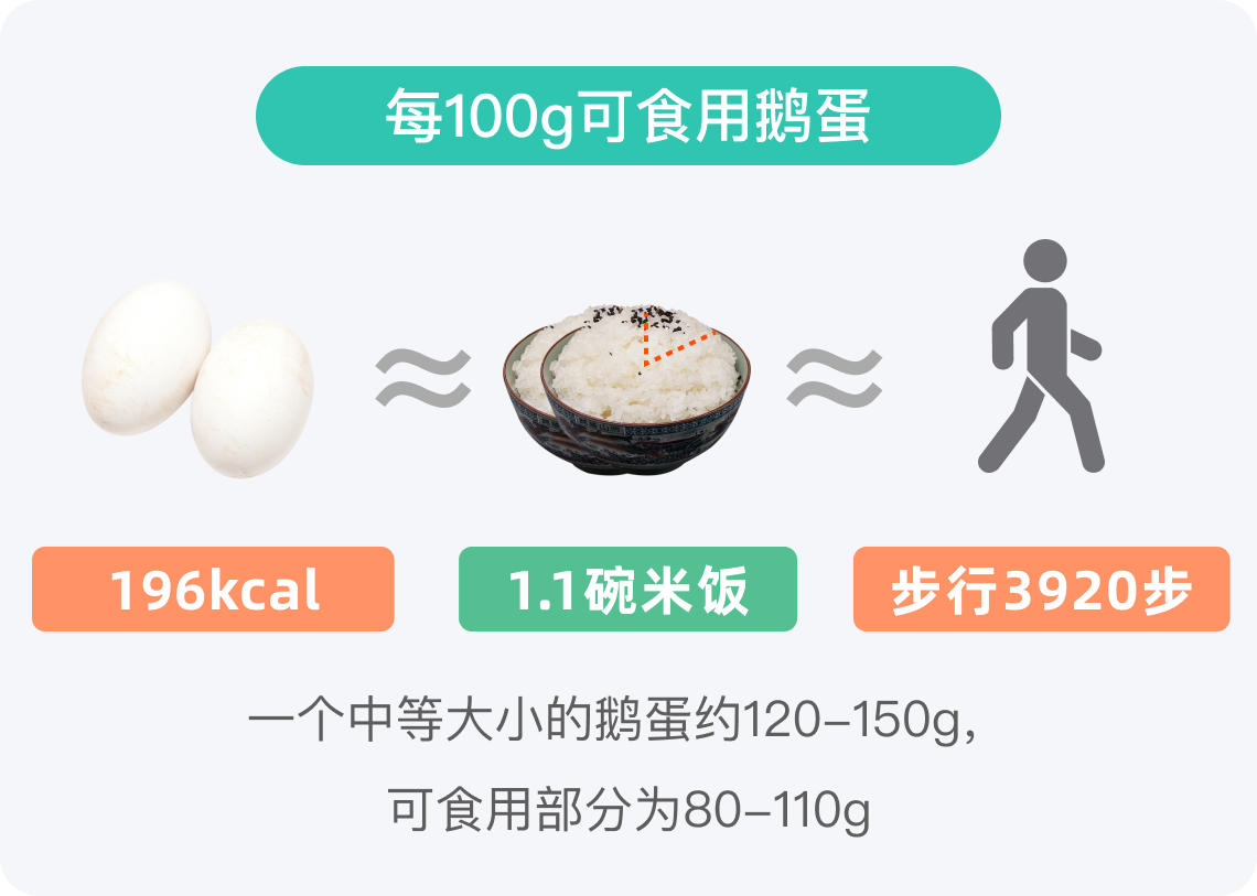 一个中等大小的鹅蛋约为120-150g,可食用部分大约为80-110g,大约相当于4/9-5/8碗米饭的热量。对于部分成年人,一餐热量需求约为500-800kcal,100g鹅蛋的热量在一餐中所占比例相对适中。