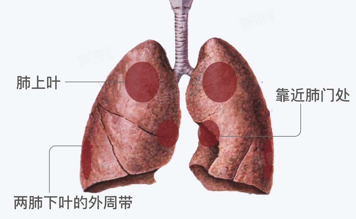 此处的肺泡细胞长期受到吸入性颗粒和有害气体的刺激,血液循环相对较差,不利于有害物质的清除。结节形态可能不规则,边界不清,容易与周围组织粘连。