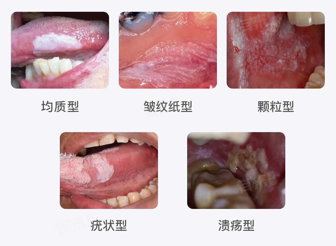 口腔白斑是口腔黏膜上以白色为主的损害,属于癌前病变或潜在恶性疾患范畴,根据临床表现,口腔白斑可以分为均质型、皱纹纸型、颗粒型、疣状型、溃疡型。