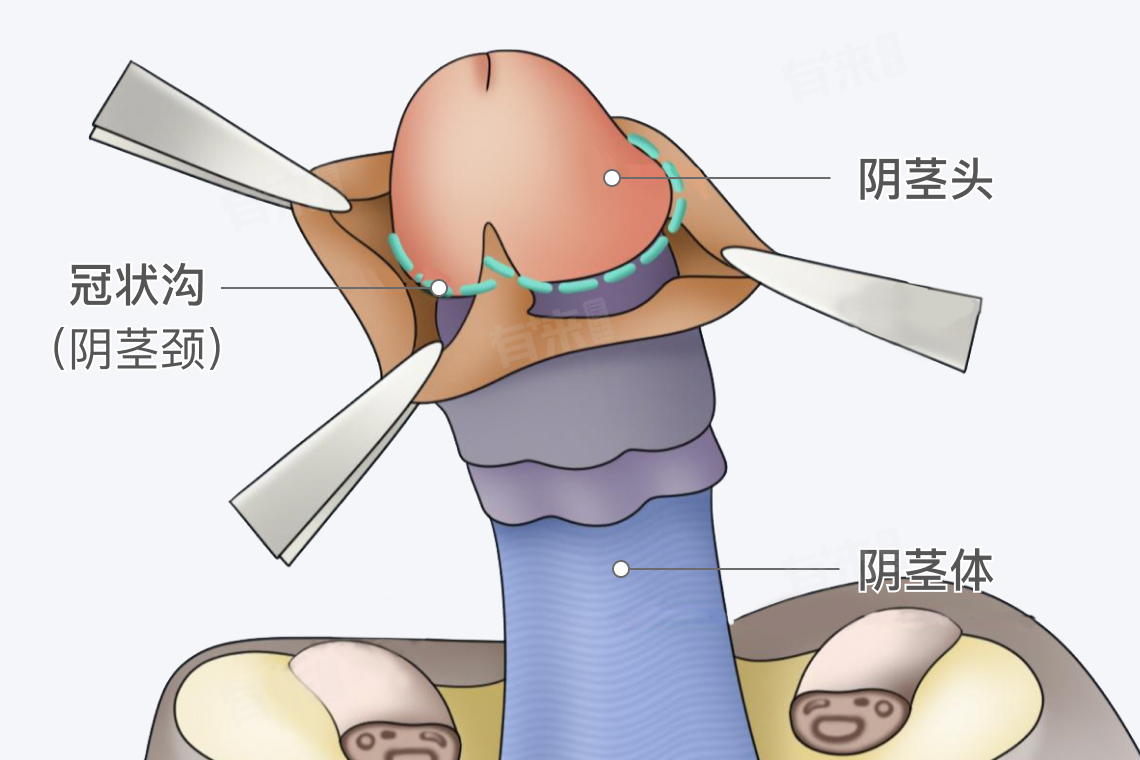 冠状沟紧密环绕在龟头的基部,是龟头与阴茎体之间的过渡区域。冠状沟的内侧是龟头,龟头表面覆盖着黏膜,较为敏感。