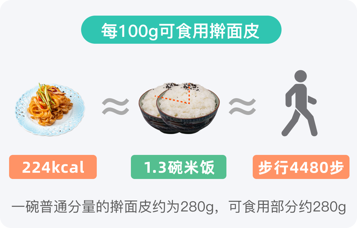 以一碗擀面皮为例,约重280g,其总热量大约为627kcal,这相当于1.9碗米饭的热量。这个热量值在普通一餐中的占比高,因此,合理控制食用量显得尤为重要。