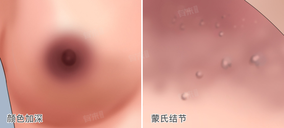 乳房可能会变得更柔软,并伴有胀痛感,乳头和乳晕的颜色会加深。乳房还可能会增大,并有一种饱满和刺痛的感觉,奶头周围的小颗粒也会变得比较突出,称为蒙氏结节。
