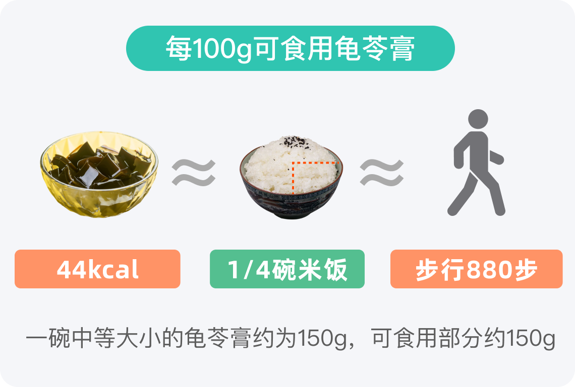 对于成年人而言,一碗中等大小的龟苓膏约150g可食用部分,所提供的热量约为66kcal,这一热量值相当于3/8碗米饭,在成人一餐中热量占比较低。