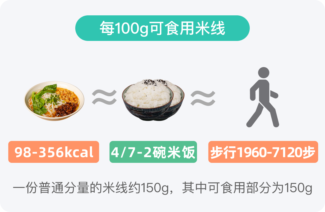 在营养学上,每100g食物热量低于100kcal的为低热量食物,100-200kcal为中等热量食物,高于200kcal为高热量食物。因此,米线的热量属于中高等热量食物。一小碗米线的可食用量为150g,热量为147-534kcal,相当于0.9-3.1碗米饭的热量。在成人的一餐中,这样的热量贡献相对较高,建议适当摄入。