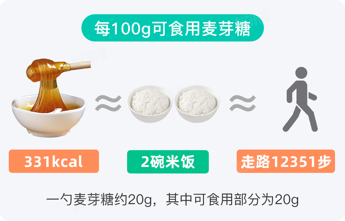 通常一勺麦芽糖约20g重,食用后热量为66kcal,大约是1/3碗150g重的米饭。每100g麦芽糖的热量,则相当于约2碗米饭。因此对于减肥人群来说,麦芽糖要少吃,因其高热量易导致热量摄入超标。