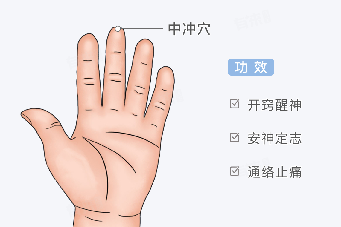 2、安神定志:现代社会人们压力较大,容易出现心烦意乱的情绪,按摩中冲穴可以泻心经的火热,安定心神,比如,当一个人因为工作压力大而心烦不安、难以入睡时,睡前轻轻按压中冲穴,有助于平复情绪,促进睡眠。