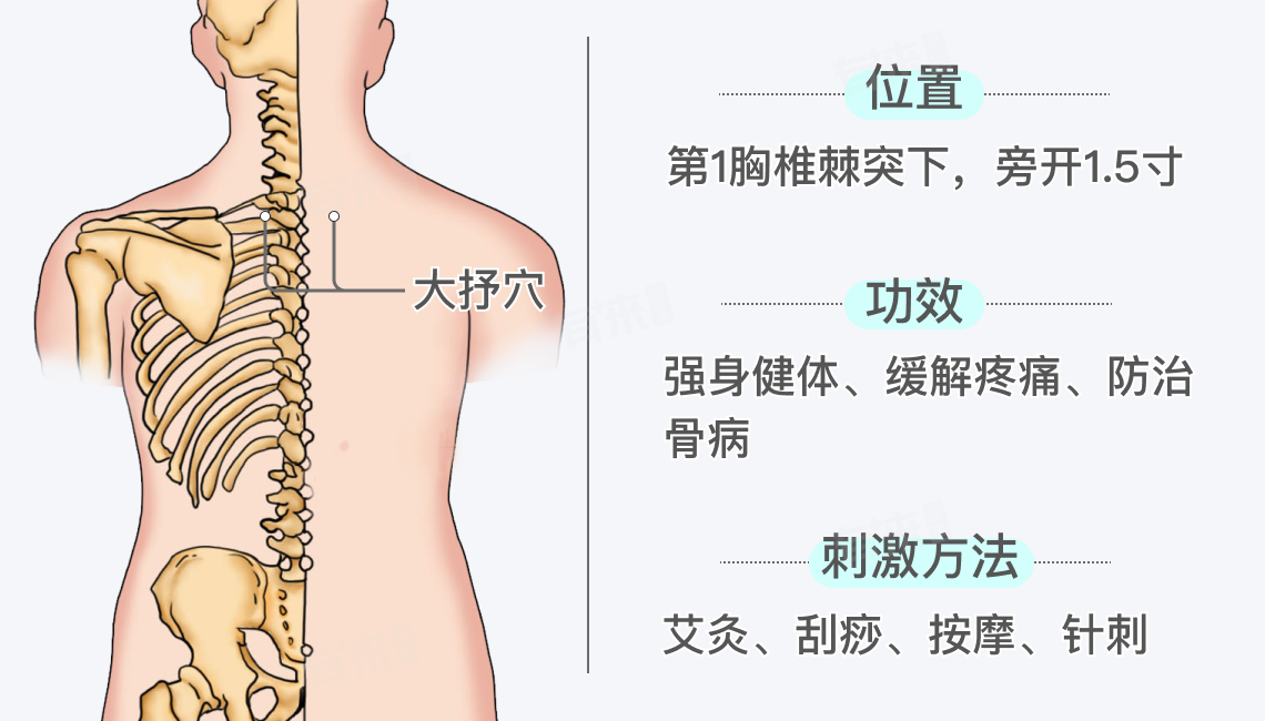 3、防治骨病:由于大杼穴所在位置靠近脊柱和骨骼,且与气血运行密切相关,所以它在防治骨病方面也有一定的作用。在骨质疏松、颈椎病、胸椎病等疾病的预防和治疗中,适当刺激大杼穴可以改善局部的气血供应,对维护骨骼健康起到辅助作用。