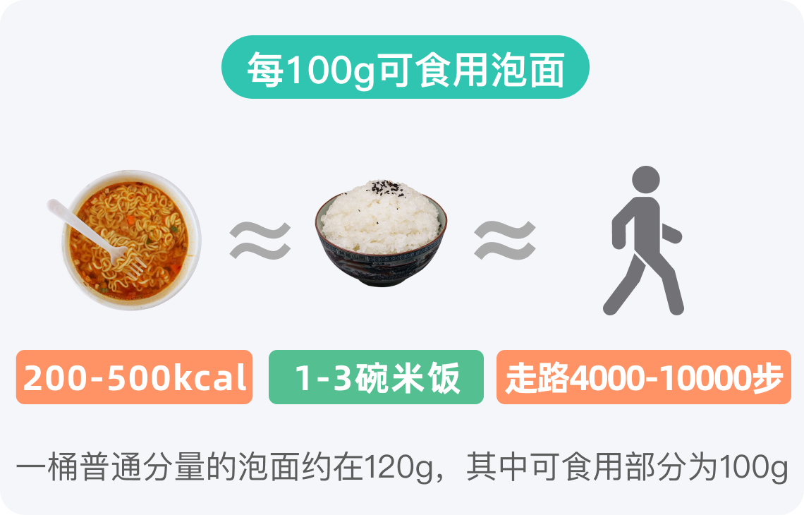 市面上的泡面热量相对比较高,每100g泡面的热量通常在200-500kcal,热量来源主要是面饼中的碳水化合物以及调料包中的油脂、盐分与少量添加物。泡面在某些特定情境下适合于生活节奏快、时间紧迫难以准备其他餐食的人群,比如忙碌的上班族在加班时、长途旅行者途中应急等情况。但由于其营养不均衡且高盐、高油,并不适宜长期作为主食频繁食用。一般来说偶尔食用泡面是可以接受的,但建议每月食用次数不超过1-2次,且单次泡面食用量(以面饼计)最好控制在80-100g。