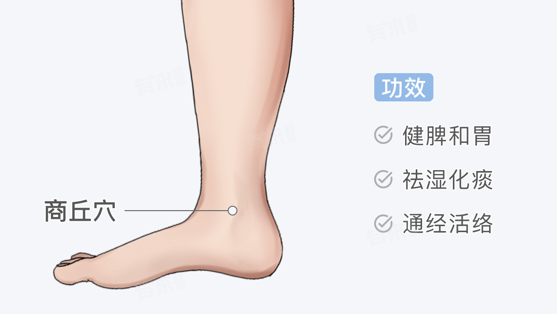 2、祛湿化痰:商丘穴作为脾经穴位,能够增强脾脏运化水湿的能力,使体内多余的水湿得以代谢排出体外,同时通过调节脾脏功能,减少痰液的生成,从而达到祛湿化痰的效果。