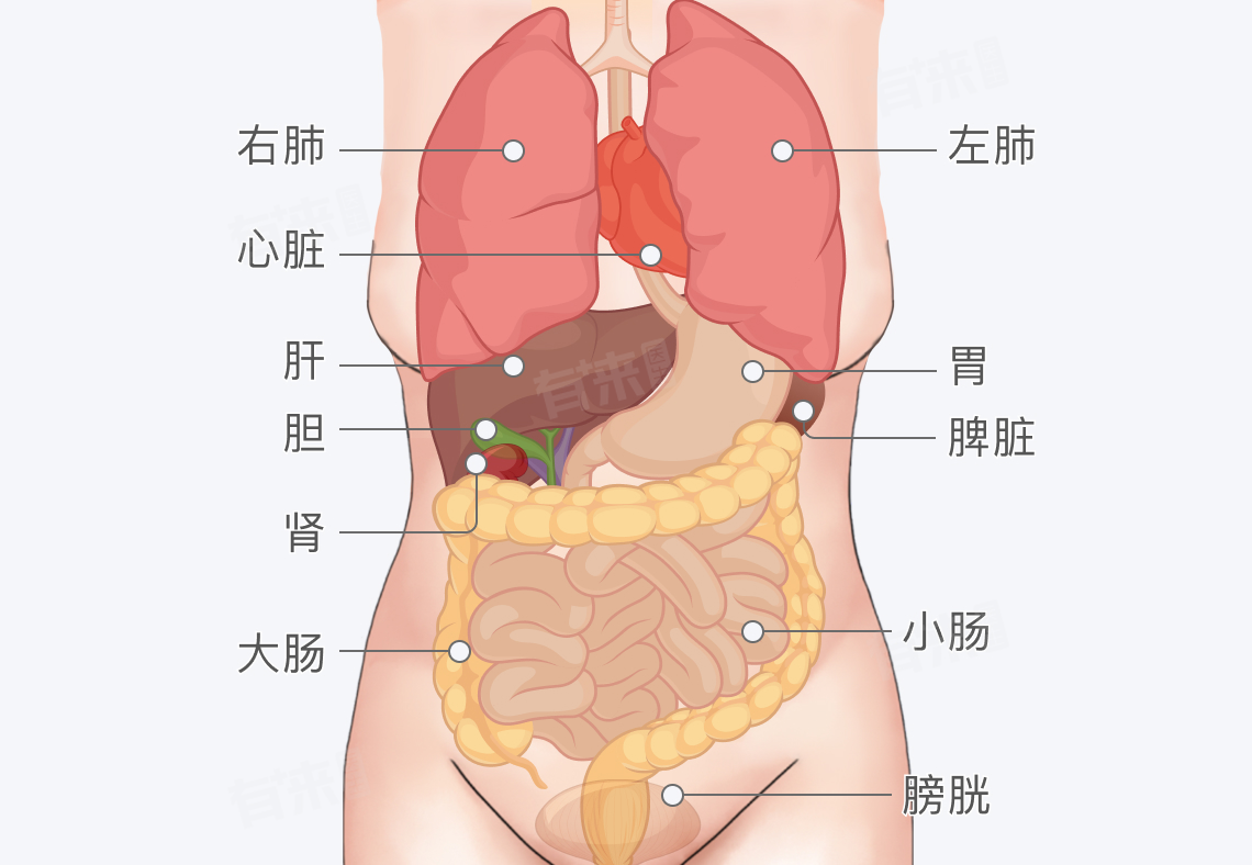 人体五脏六腑是相互协作、紧密联系的有机整体,各自有着独特的结构,五脏主要为心、肝、脾、肺、肾,还有六腑为胃、小肠、大肠、胆、膀胱、三焦。