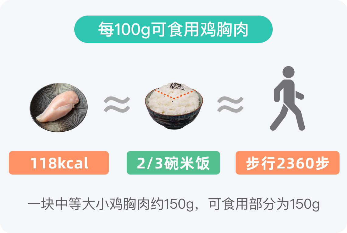每100g可食用鸡胸肉热量为118kcal,一块150g的鸡胸肉,可食用部分为150g,热量约177kcal,相当于1碗米饭。对于成年人一餐500-800kcal的热量需求而言,鸡胸肉占比适中。