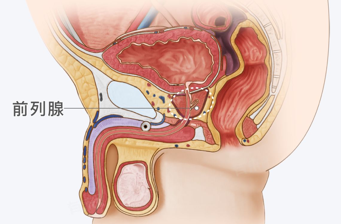 前列腺位于盆腔内,在膀胱与尿生殖膈之间。上方是膀胱颈部,这使得前列腺和膀胱紧密相连,尿液从膀胱排出时需要经过前列腺所包围的尿道部分。