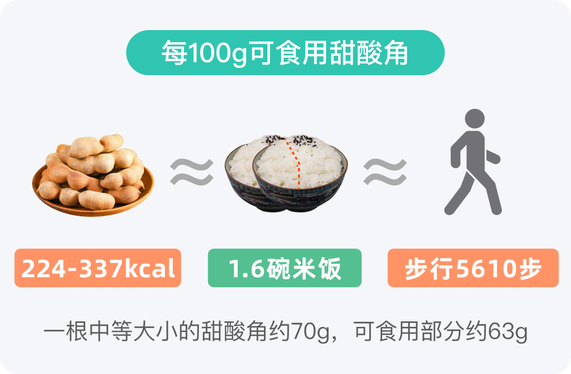 甜酸角的可食用部分约为整体重量的90%以上,一根中等大小的甜酸角约70g,可食用部分约63g,热量计算取中间值,约为177kcal。为了更直观地理解这一热量水平,可以将其换算成日常主食米饭的热量。每100g米饭的热量约为116kcal,一碗米饭约150g,该热量相当于1碗米饭的热量。