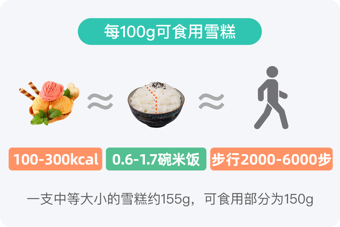 每100g雪糕热量在100-300kcal,一支雪糕可食用部分约150g,其热量范围在150-450kcal,相当于7/8-2.6碗米饭的能量。一支雪糕的热量占成人一日所需总能量的大约6%-22.5%,具体比例依个人日常活动量而异。