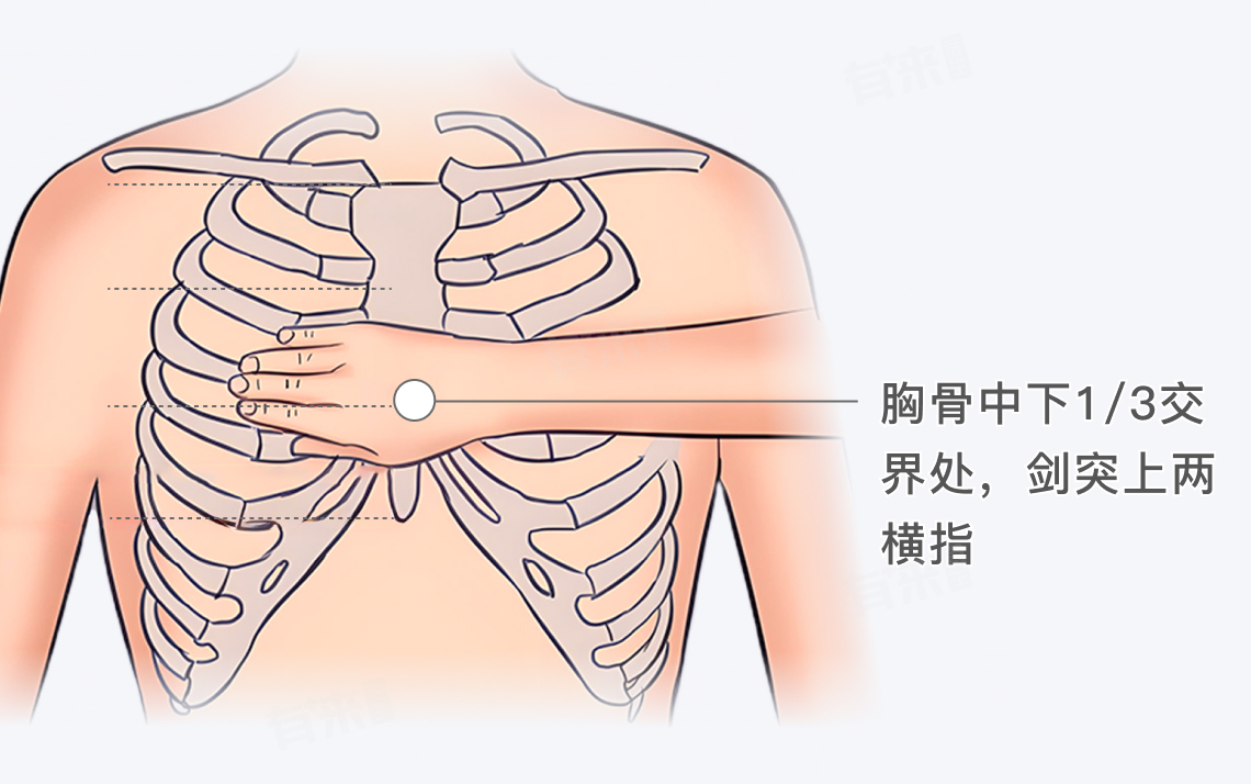 - 剑突上两横指:另一个定位方法是找到剑突(胸骨下端的软骨部分),然后在其上方放置两横指的距离,这个位置也大致对应于胸骨中下1/3的交界处。