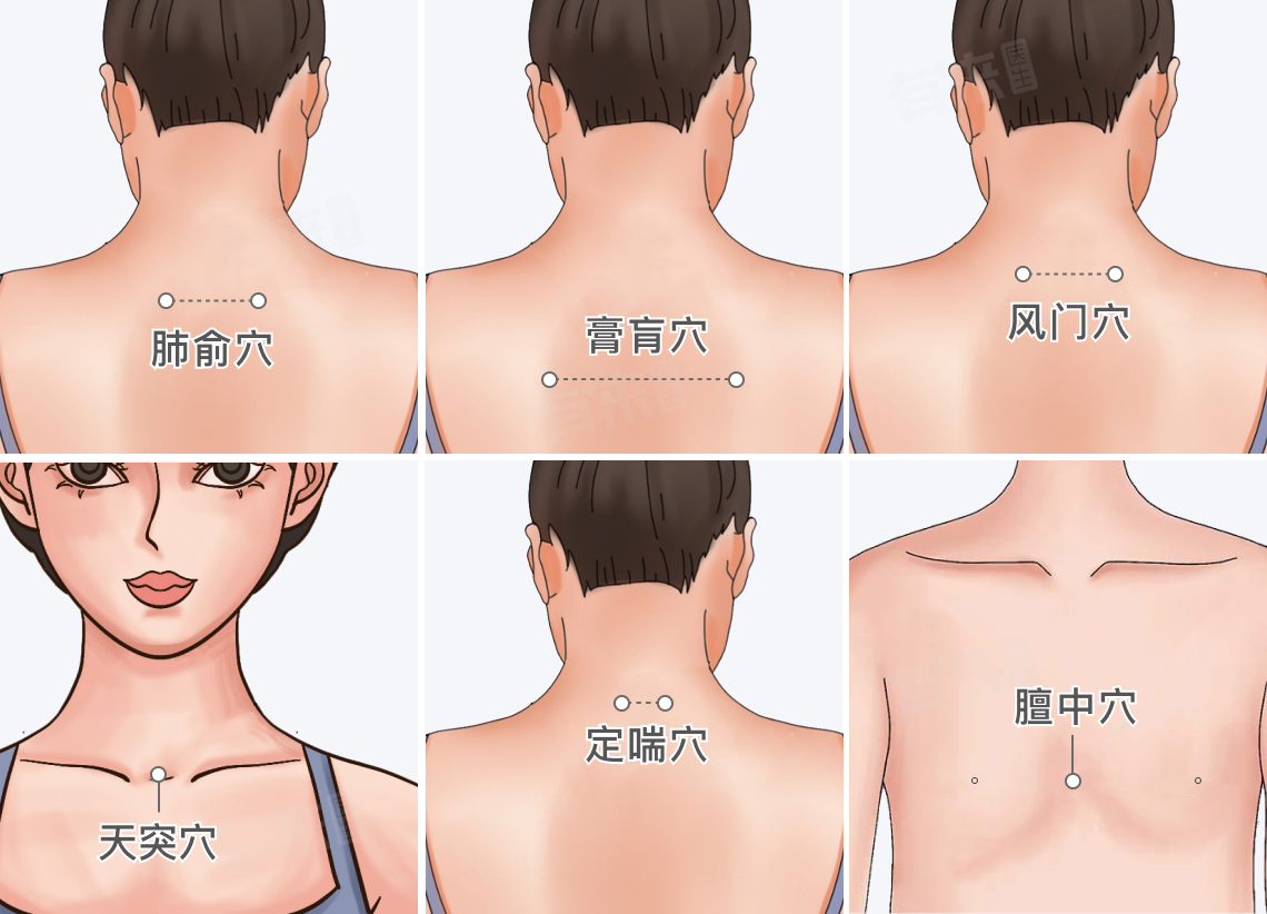 位于胸部正中线上,平第4肋间,两乳头连线的中点。膻中穴是气会之穴,可调节气机,宽胸理气,适用于过敏性鼻炎伴有胸闷、气短等症状的患者。