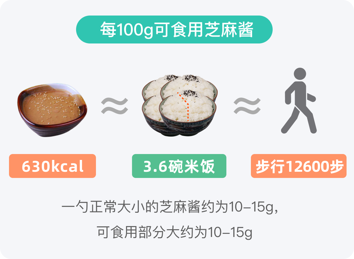 在营养学对食物热量的分类中,每100g热量低于100kcal为低热量食物,100-200kcal为中热量食物,高于200kcal为高热量食物。每100g可食用芝麻酱热量高达630kcal,显然属于高热量食物。一勺正常大小10-15g的芝麻酱,可食用部分为10-15g,其热量约为63-94.5kcal,等于2/5-1/2碗米饭。对于部分成年人一餐500-800kcal的热量需求而言,这一勺芝麻酱的热量占比不容忽视。