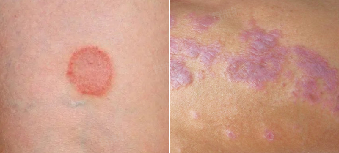 皮肤扁平苔藓的典型皮损为紫红色或紫蓝色多角形扁平丘疹,这些丘疹的境界通常比较清楚,具有蜡样光泽。丘疹的形状多为圆形、椭圆形或多角形,表面较为光滑,触摸时较为平坦,这些丘疹可以融合成斑块,斑块表面也可能有轻微的鳞屑。随着病情的发展,丘疹或斑块可能会逐渐消退,并留下色素沉着。