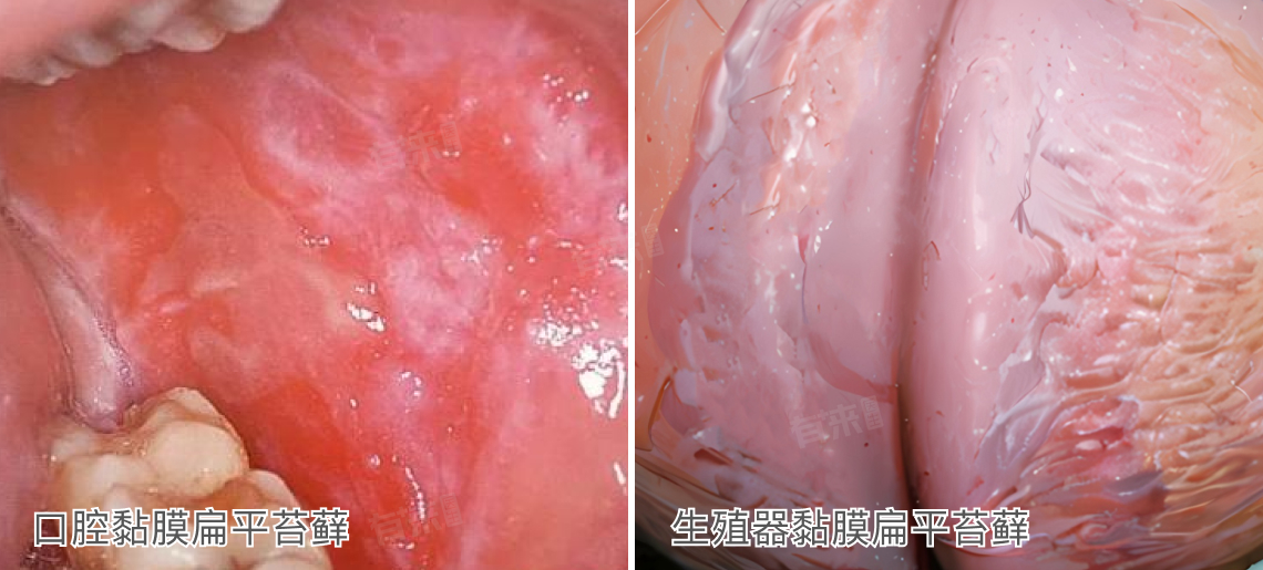 生殖器黏膜的扁平苔藓与口腔黏膜损害有相似之处。在女性生殖器部位,主要见于大阴唇、小阴唇、阴蒂和会阴等区域,表现为白色的丘疹、斑块或糜烂。男性生殖器上,主要在龟头、包皮等部位出现类似损害,患者会感到局部瘙痒、疼痛或烧灼感。