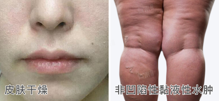 甲减患者皮肤的皮脂腺和汗腺分泌减少,角质层代谢变慢,使得皮肤变得干燥、粗糙,皮肤表面可能出现鳞屑。同时,患者的皮肤可能出现非凹陷性黏液性水肿,质地较为坚硬。