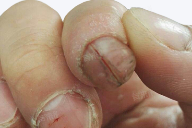 由于甲状腺功能减退,患者的指甲可能变得脆弱易碎,出现裂纹。