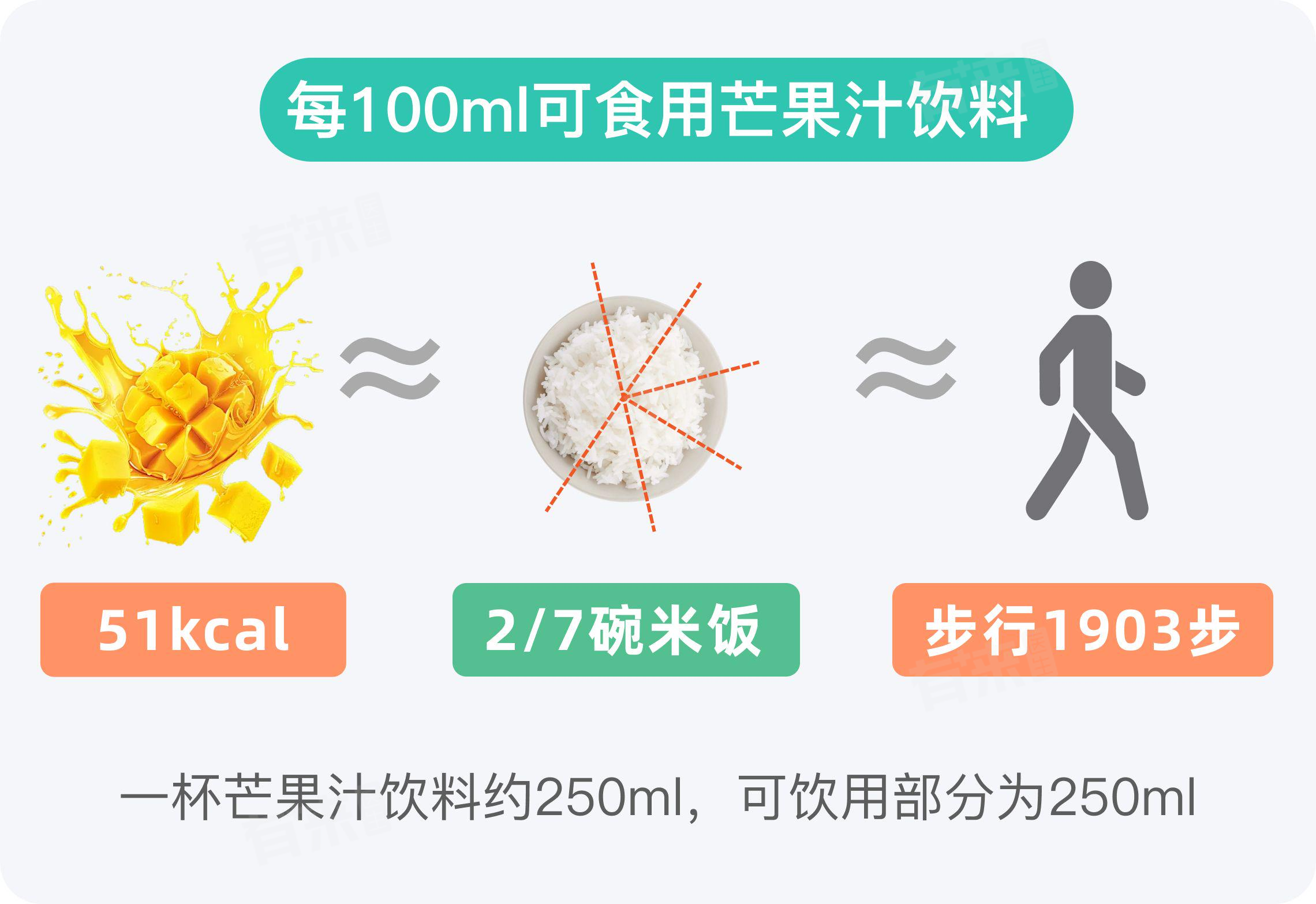 根据具体配方和加工方式的不同,市售芒果汁饮料的热量范围可能有所差异,但一般而言,每100ml芒果汁的热量约为51kcal。