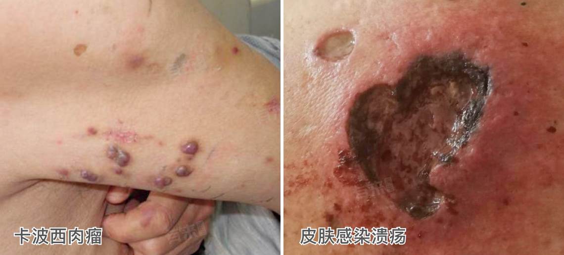 3、皮肤感染溃疡:由于免疫系统极度衰竭,患者极易发生各种皮肤感染,包括细菌、真菌和病毒感染等。这些感染可能导致皮肤出现红肿、疼痛、脓疱、溃疡等症状,溃疡面可能较大,边缘不规则,伴有脓液渗出和臭味。