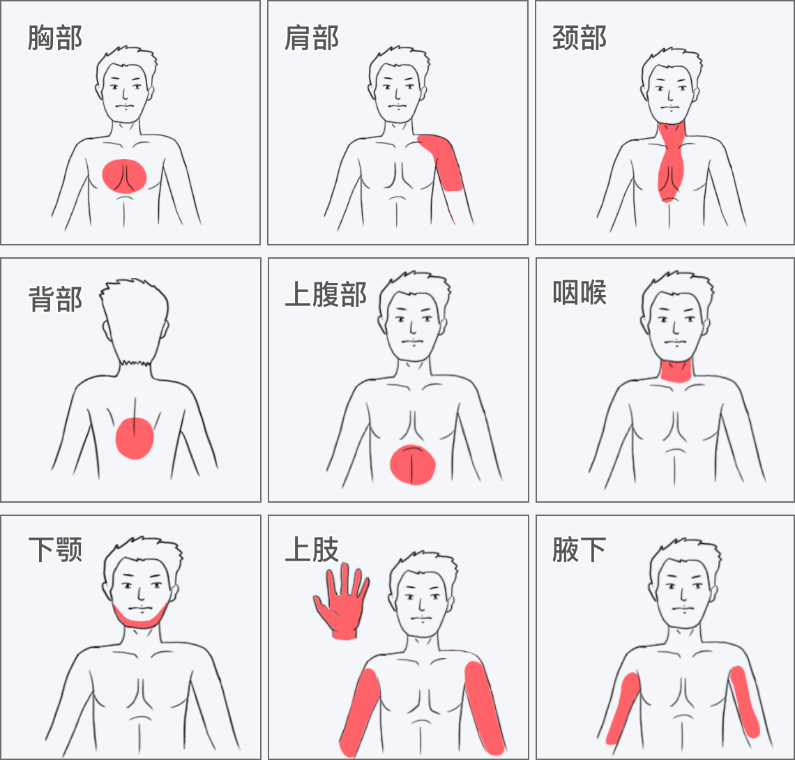 3、上肢:心脏疼痛可放射至上肢,特别是左臂,包括手指尖和前臂内侧。少数情况下,疼痛可能放射至右臂或双臂,伴随出汗、恶心、呼吸困难等症状。