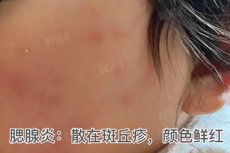 - 外观特征:部分腮腺炎患者可能会出现皮疹,多为散在的斑丘疹,颜色鲜红,大小不一,可分布于面部、颈部、躯干等部位。