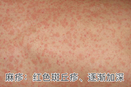 - 外观特征:麻疹疹子通常在发热3-4天后出现,先出现在耳后、发际,然后逐渐向面部、颈部、躯干、四肢蔓延,最后到达手掌和足底,初期为红色斑丘疹,疹间皮肤正常,随着病情发展,这些斑丘疹会逐渐融合成片,颜色也会加深,变为暗红色。